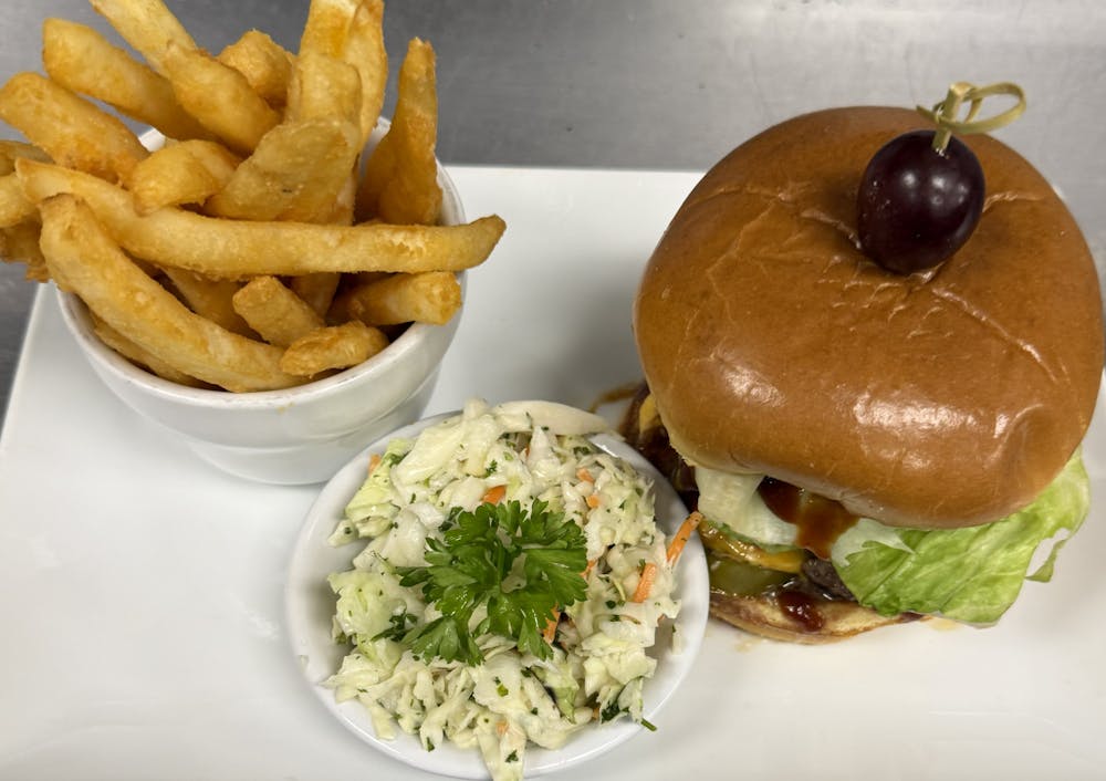 8oz Black Angus Burger, BBQ sauce, American cheese, slice pickles, jalapeno pepper, lettuce, onion & tomato on hamburger bun with fries & coleslaw.