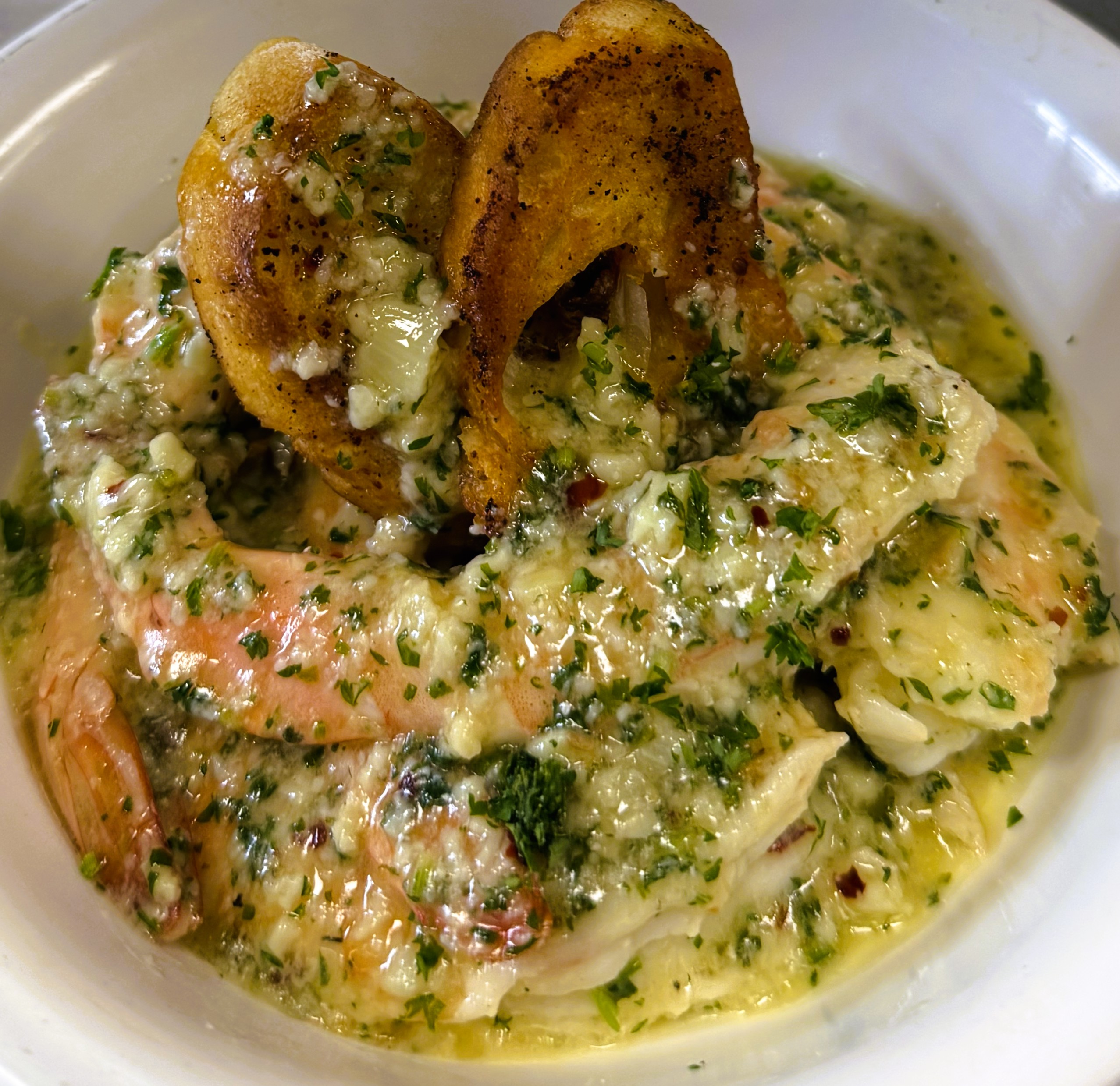 (5) shrimps (u-15) on crostini bed with lemon butter, parsley, feta cheese in a white wine sauce.