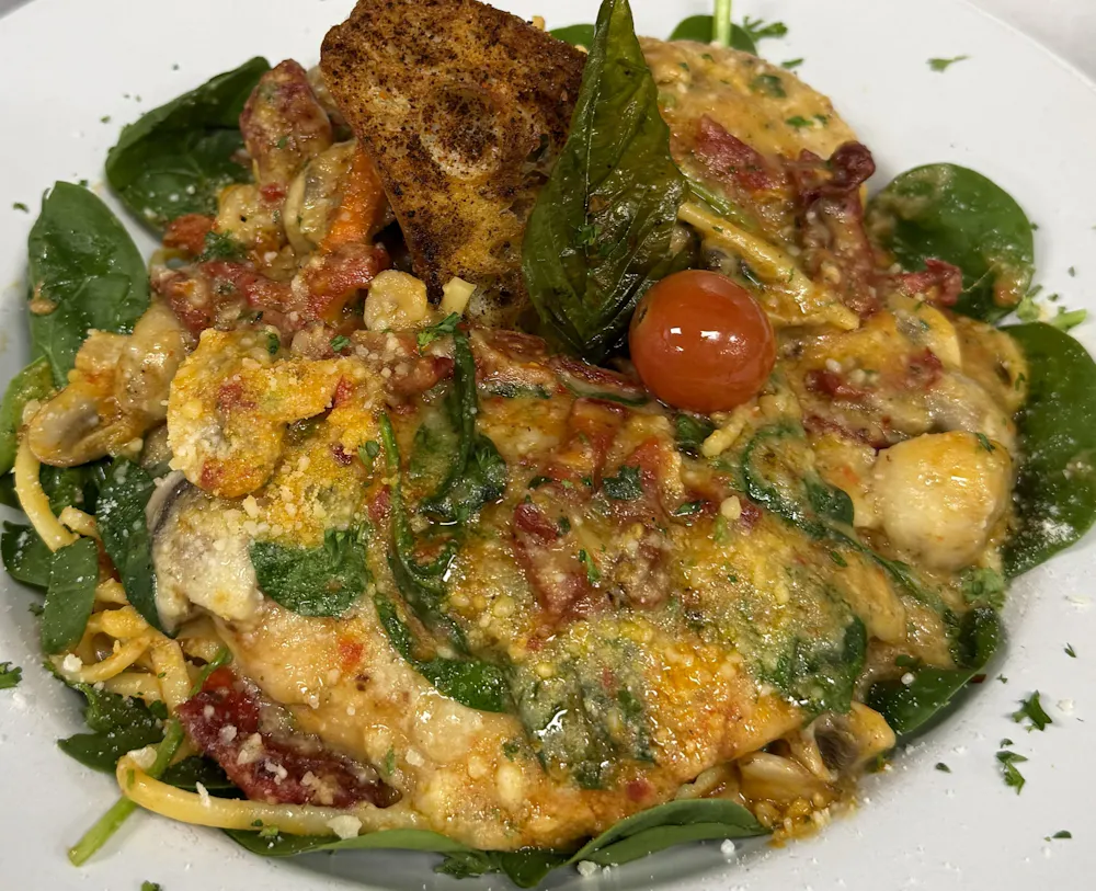 (2) chicken breast sauteed with mushrooms, sun-dried tomatoes, spinach, roasted peppers & creamy pesto sauce over linguine pasta.