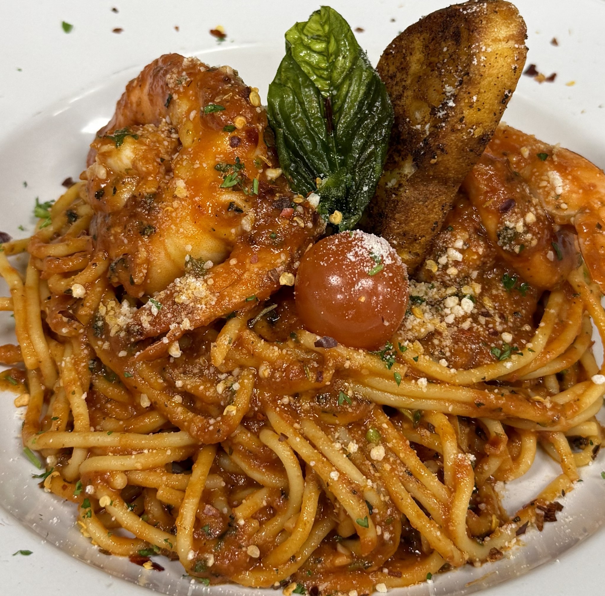 (4) jumbo spicy shrimp featuring blend of Italian hot peppers, roasted garlic over spaghetti in a marinara sauce.