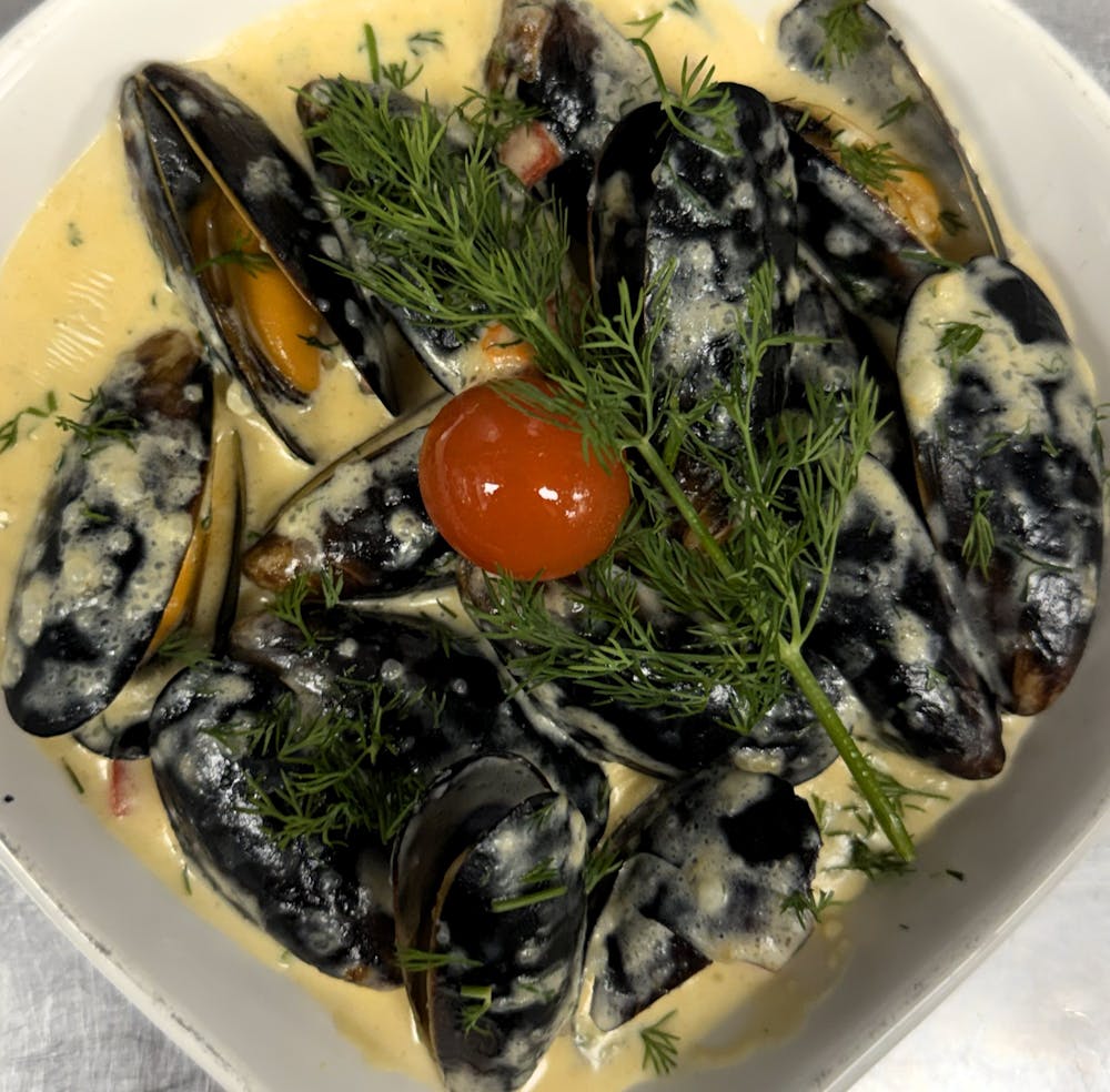 1lb PEI mussels, fresh dill, roasted peppers, EVOO-vinaigrette Bianco cream