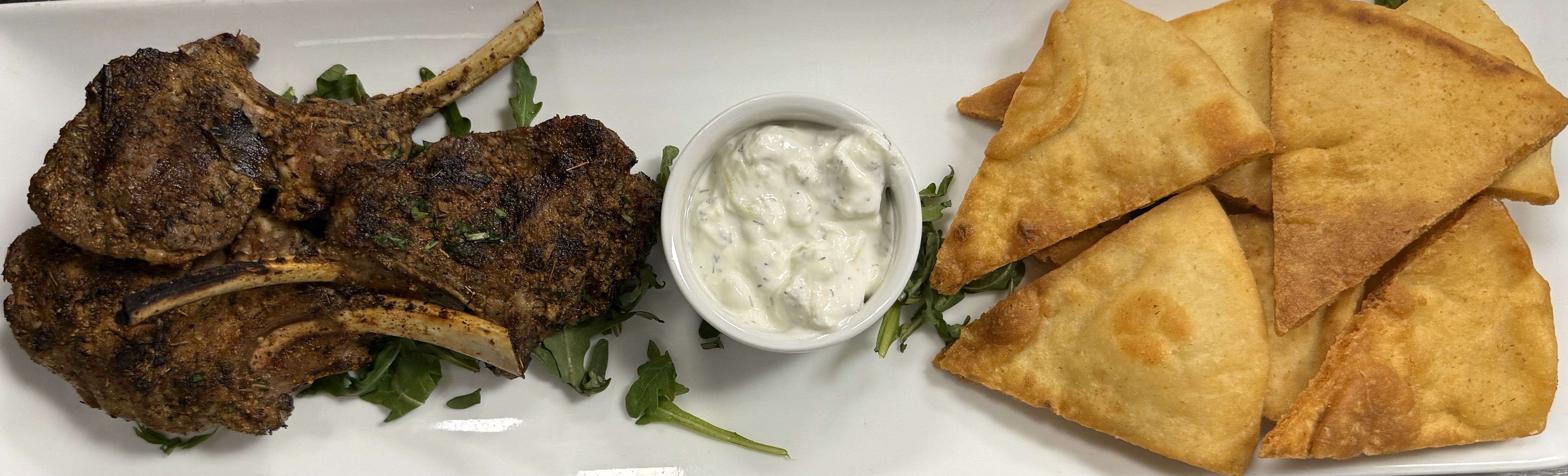 (3) char-grilled blackened lamb chops, tzatziki sauce & charred pita chips.
