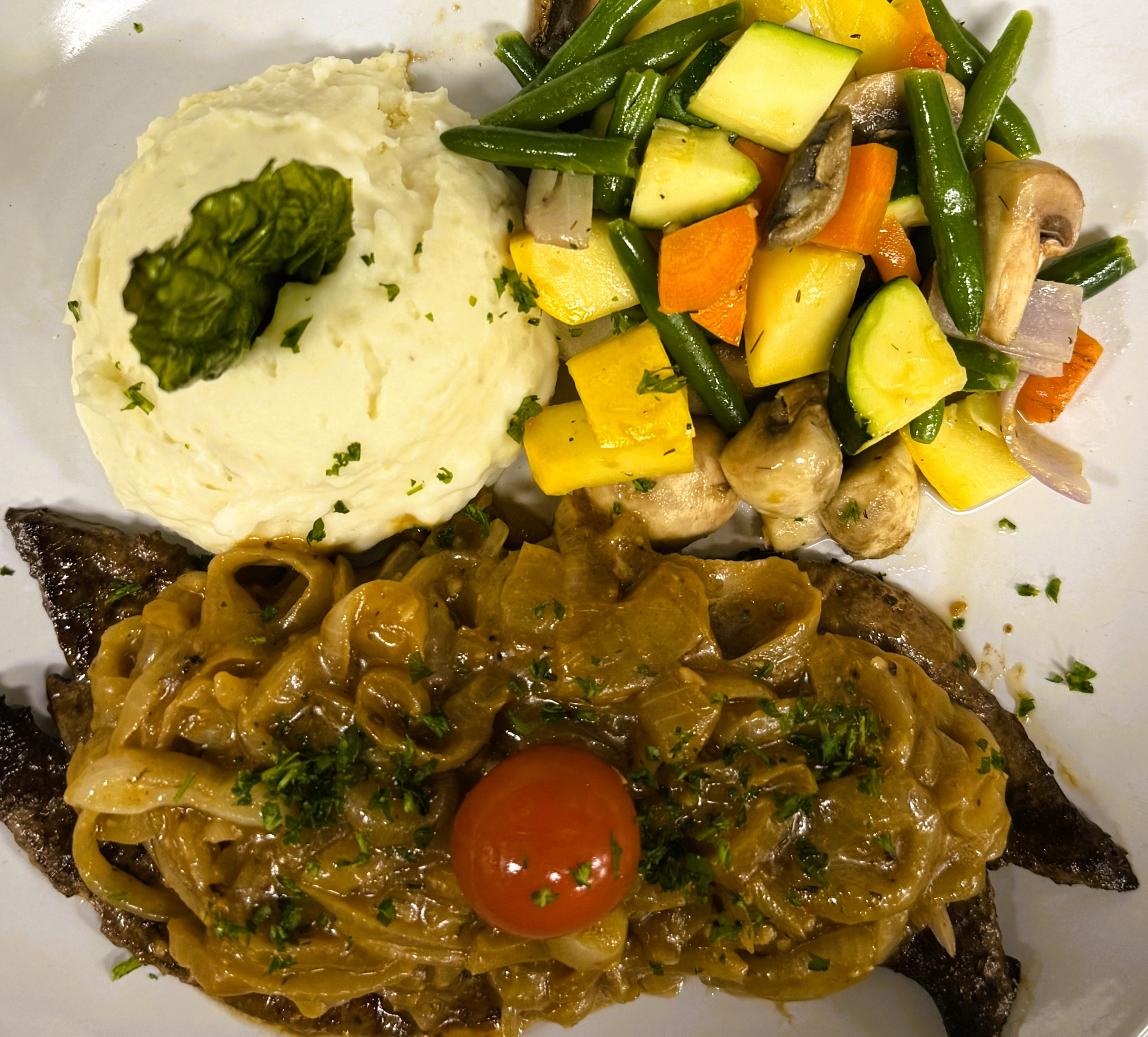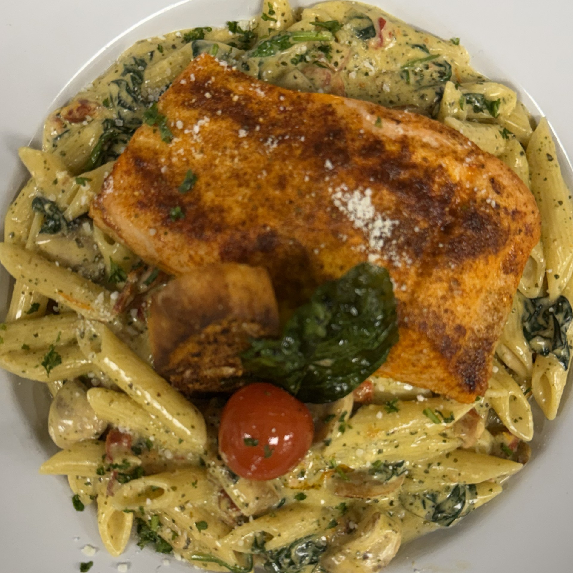 Atlantic salmon, mushrooms, sun-dried tomatoes, spinach, roasted peppers in a pesto cream over penne.