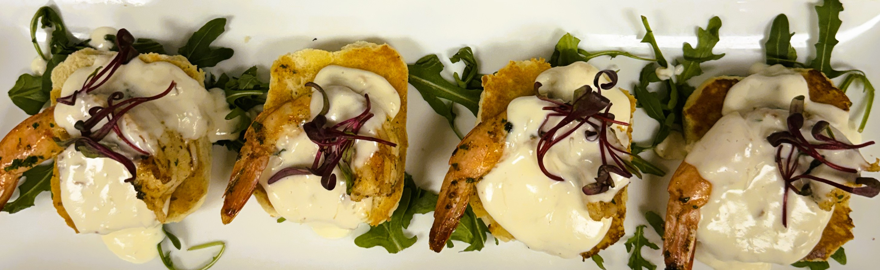 (4) butter poached gulf shrimp on a golden biscuit topped with crab gravy.